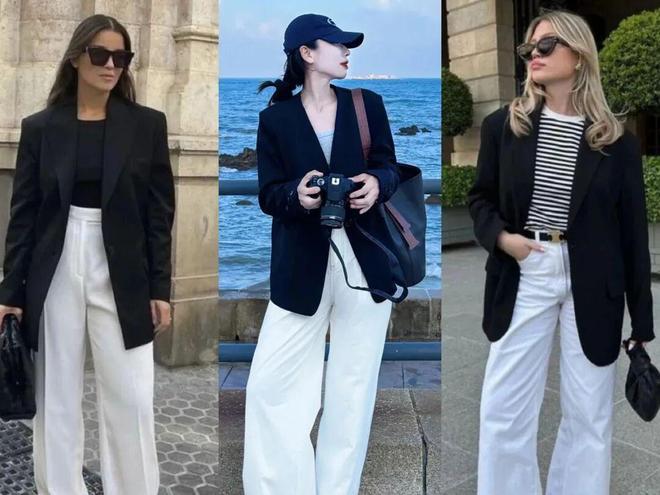 黑色廓形西装自带气场,内搭蕾丝拼接小衫,小性感藏在细节里,下身配白色阔腿裤,视觉上拉长拉直双腿,再踩一双小金扣单鞋,简约又高级,日常通勤、休闲逛街都能穿,松弛感拉满。