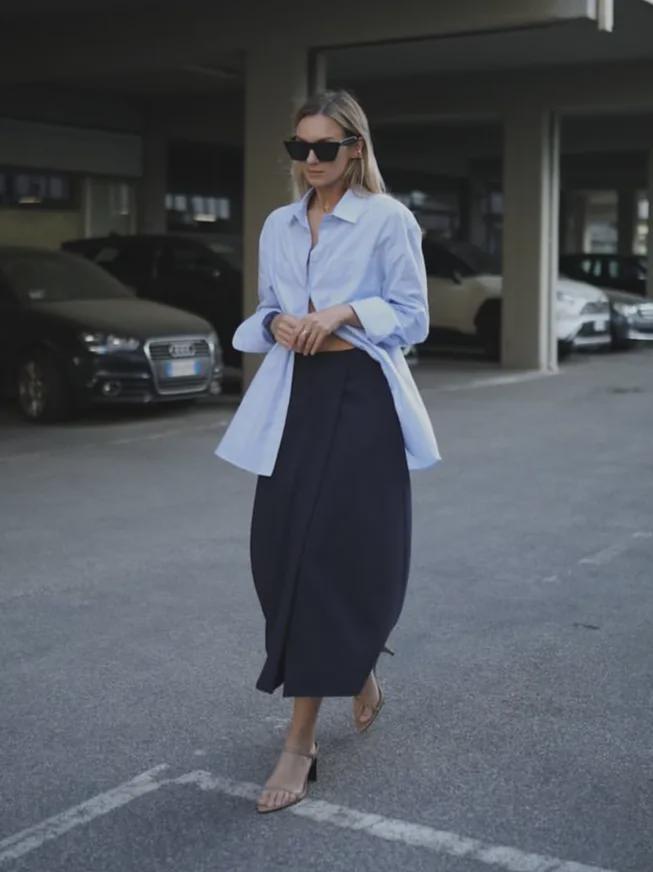 蓝色中长款衬衫,搭配黑色半裙,能穿出不费力的时髦感可以把女性的帅气魅力发挥得更淋漓尽致搭配一双高跟鞋,展现一个女人力量又柔美的模样,完美诠释了休闲风格的魅力,利落之余尽显精致