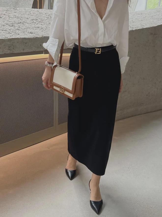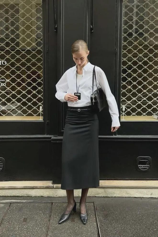 白色衬衫搭配黑色半裙,兼具实用性与时尚感,能在不同场合展现出独特的魅力而将衬衫下摆塞进腰里,系上黑色腰带的细节,让日常造型不单调有质感,营造出简洁而有力的视觉效果,展现出干练与自信搭配一双黑色尖头高跟鞋,呈现出一种不刻意的大度穿出了女性的时尚与智慧