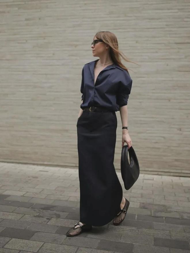 藏蓝色衬衫搭配黑色半裙,尽情释放着职场专业的高级气质,毫不违和的穿出让率性姿态气质,搭配一双个体平底鞋,不动声色的穿出了从容与松弛,任何时候都可以自信穿梭其间,为大女人风格注入了力量与态度