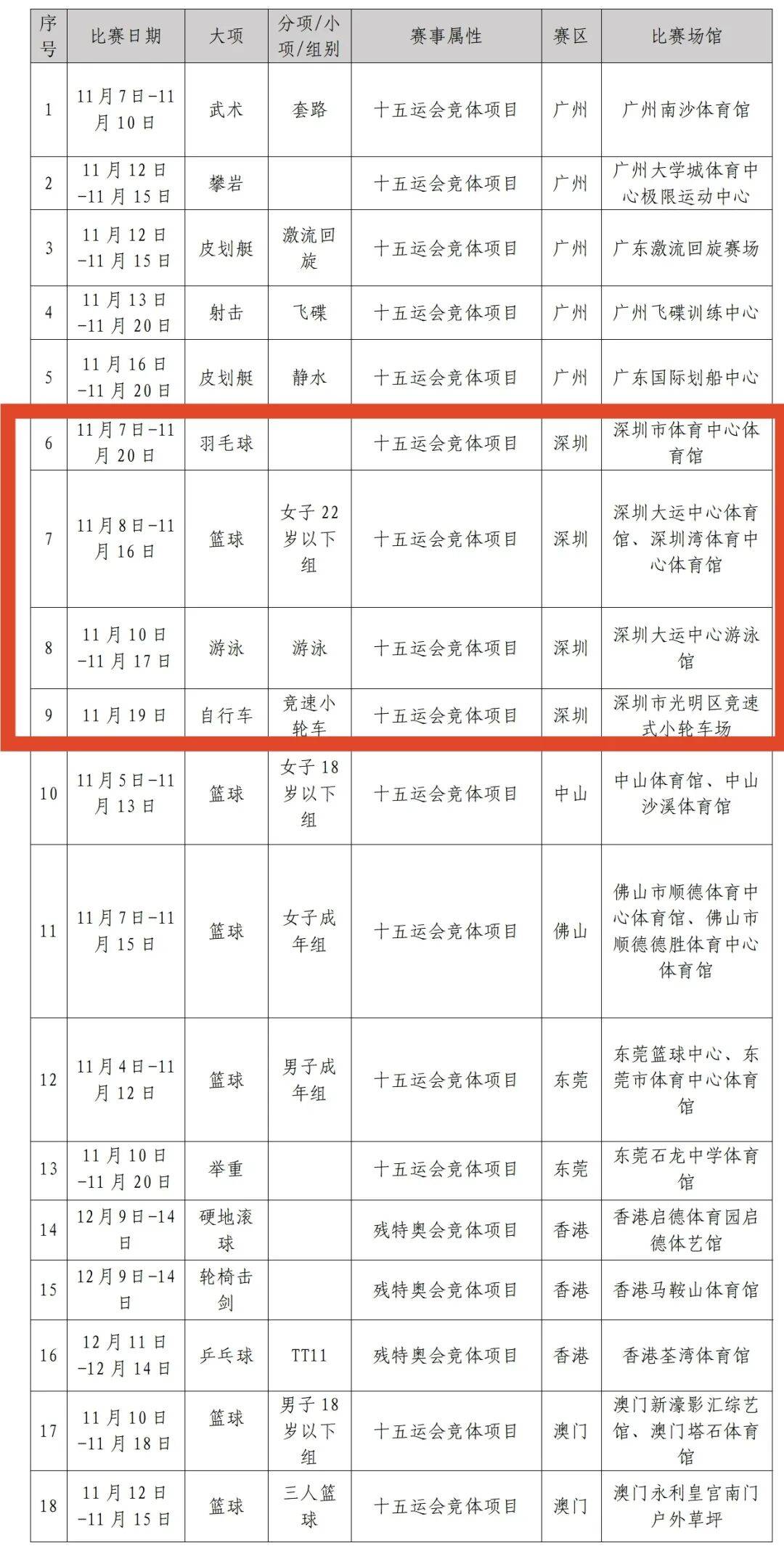 ,包括十五运会羽毛球、篮球(男子成年组、女子成年组、女子22岁以下组、女子18岁以下组)、武术(套路)、游泳、举重、自行车(竞速小轮车)、皮划艇(静水、激流回旋)、攀岩和射击(飞碟)项目,