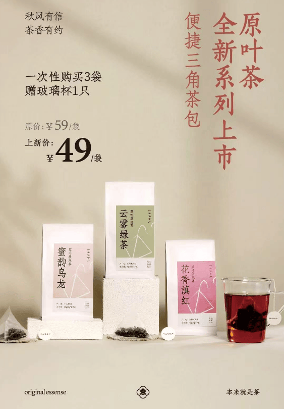 1.袋泡茶:蜜韵乌龙、云雾绿茶、花香滇红,三款原叶茶装进便捷三角茶包价49/袋(原价59),买3袋赠玻璃杯!
